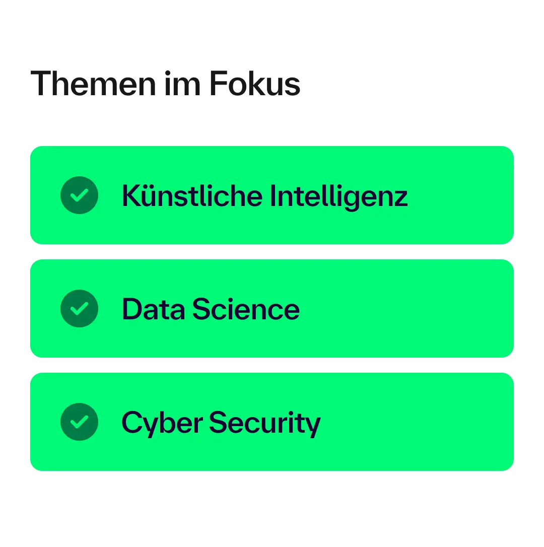 In den nächsten 1–2 Jahren werden Künstliche Intelligenz, Data Science und Cyber Security an Bedeutung gewinnen. Die digitale Transformation erfordert Fachkräfte, die KI-Technologien implementieren, Daten analysieren und Cyber-Bedrohungen abwehren können. Diese Themen sind entscheidend, um wettbewerbsfähig zu bleiben und die Sicherheit in einer zunehmend vernetzten Welt zu gewährleisten.